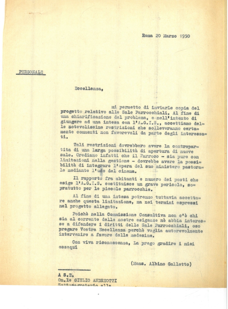 Con lettera di trasmissione di mons. Albino Galletto, consulente ecclesiastico dell'Ente dello spettacolo, all'on. Giulio Andreotti. Dattiloscritto