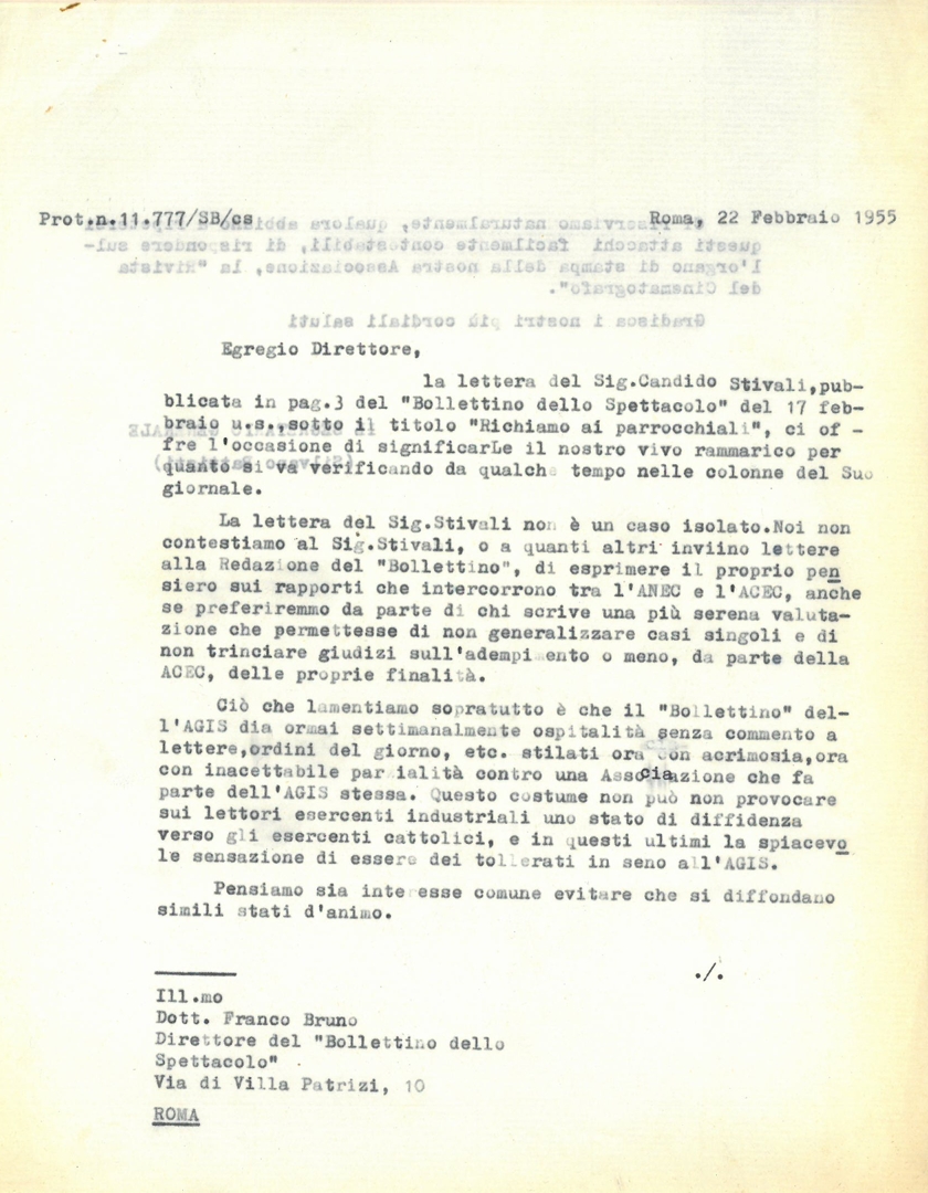 Lettera di Silvano Battisti, segretario generale dell'ACEC, a Franco Bruno, direttore del "Bollettino dello spettacolo"