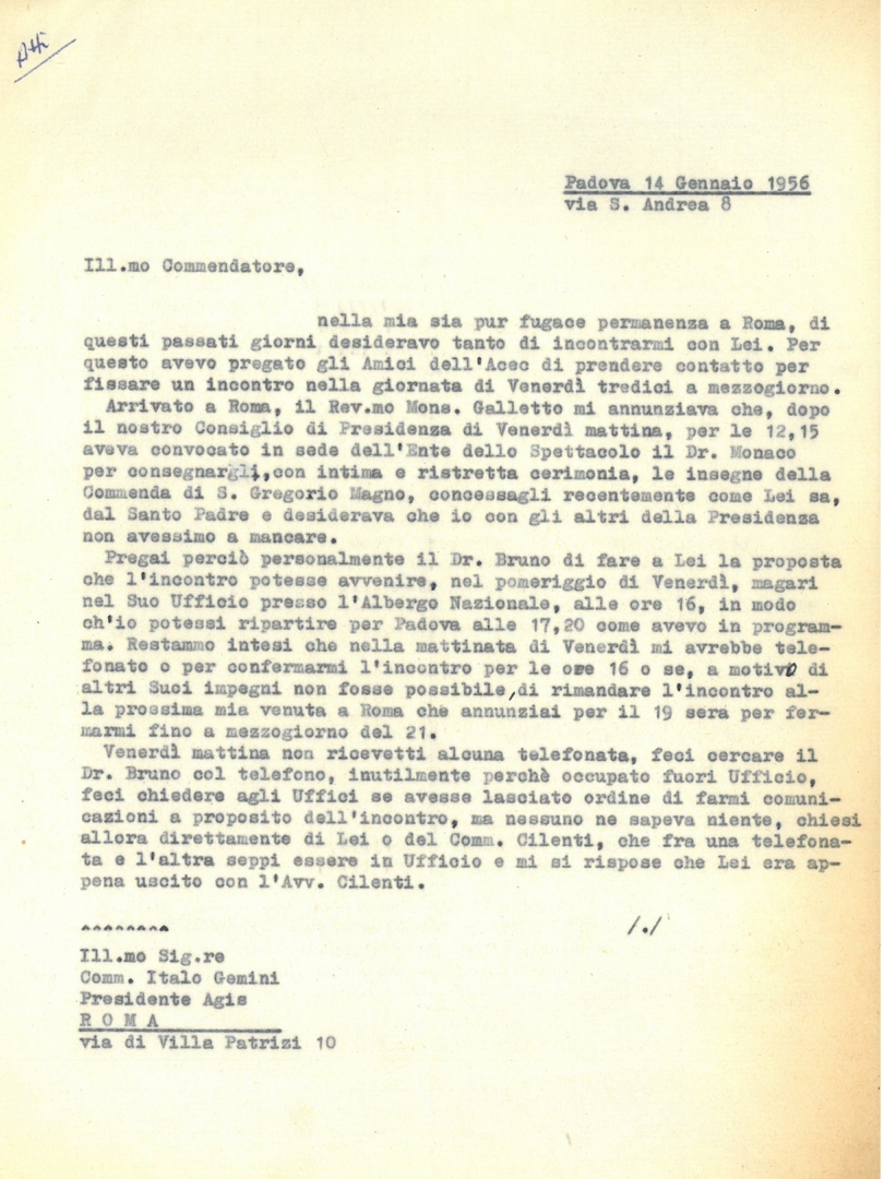 Lettera di mons. Francesco Dalla Zuanna, presidente dell'ACEC, a Italo Gemini, presidente dell'Associazione generale italiana dello spettacolo - AGIS