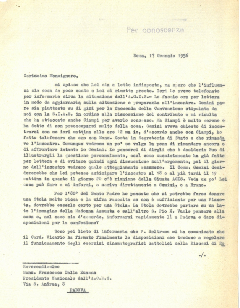 Floris Luigi Ammannati scrive a mons. Francesco Dalla Zuanna in merito alla convenzione ACEC- SIAE per i contributi alle sale cinematografiche e ad altre questioni all'ordine del giorno. Dattiloscritto