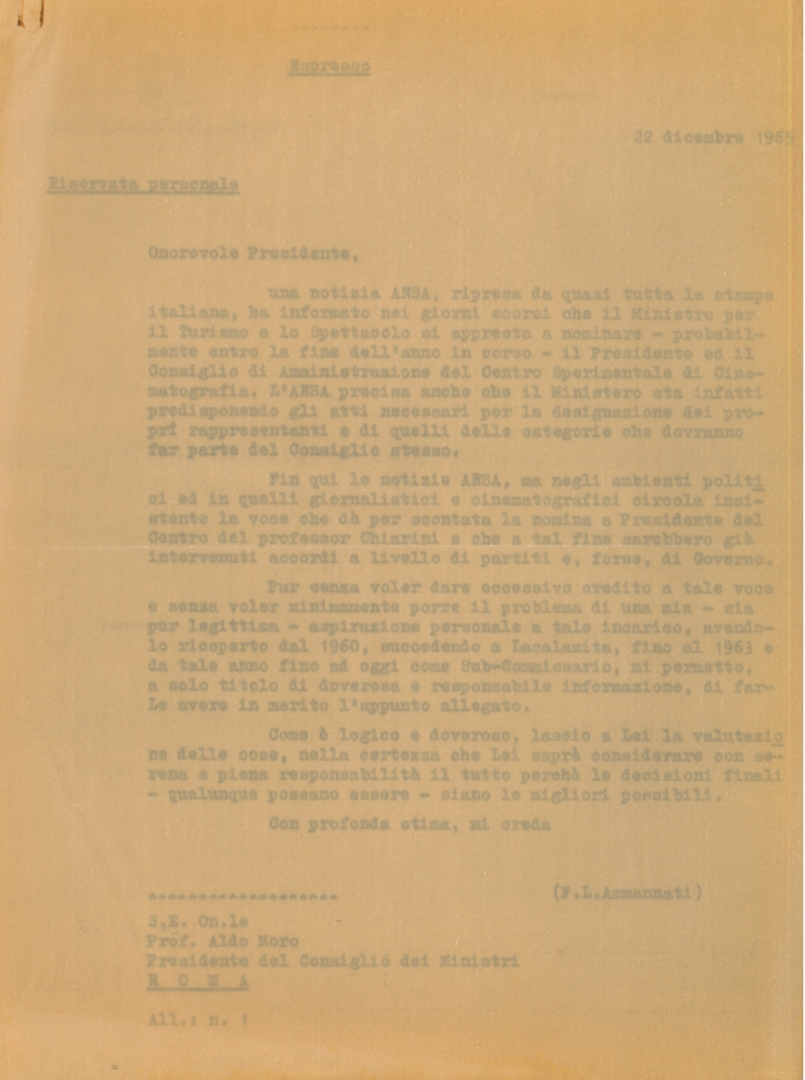 Floris Luigi Ammannati scrive all'on. Aldo Moro in merito alle nomine dei vertici del Centro sperimentale di cinematografia - CSC
