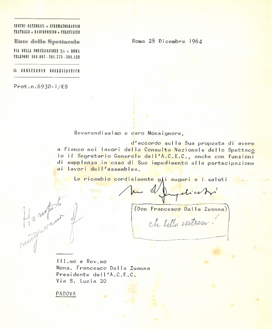 Lettera di mons. Francesco Angelicchio, direttore dell'Ufficio nazionale dello spettacolo, a mons. Francesco Dalla Zuanna, presidente dell'ACEC