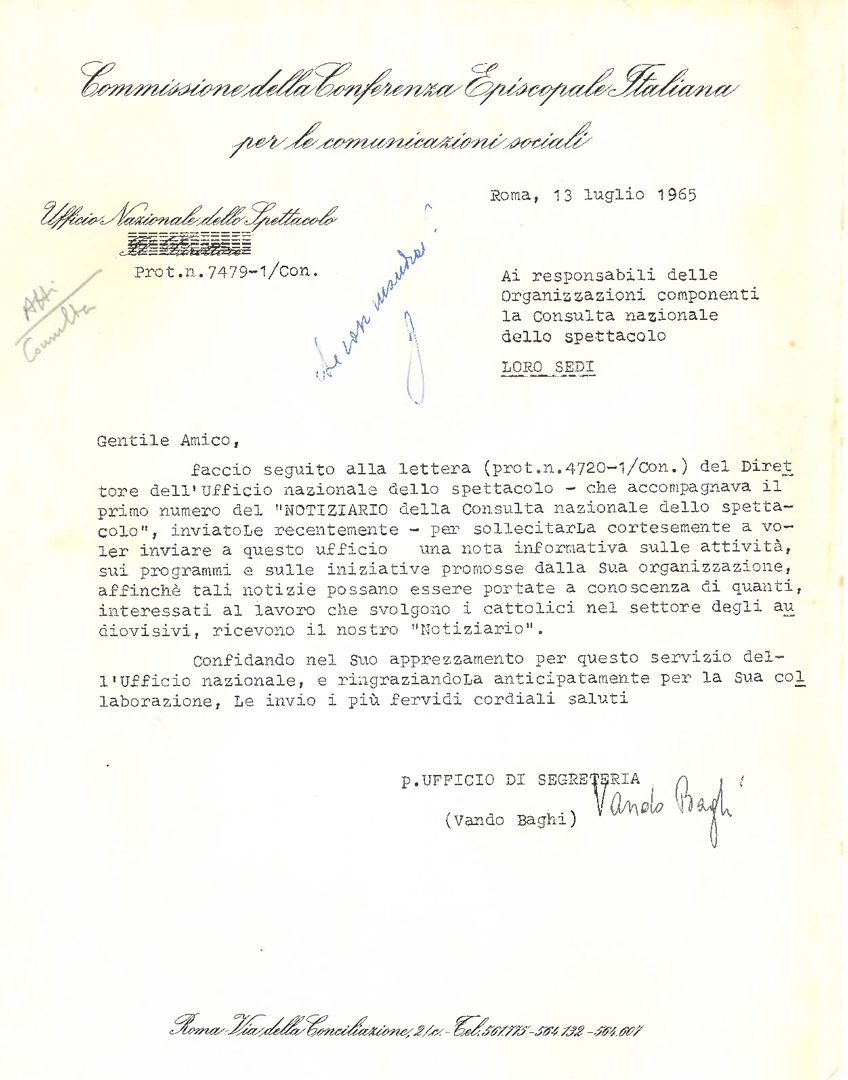 Lettera di Vando Baghi, segretario dell'Ufficio nazionale dello spettacolo, ai responsabili delle organizzazioni componenti la Consulta nazionale dello spettacolo