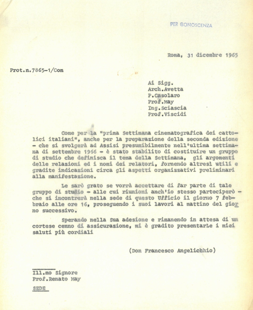 Lettera di don Francesco Angelicchio, direttore dell'Ufficio nazionale dello spettacolo, a Ildo Avetta, Mario Casolaro, Renato May, Ugo Sciascia, Fiorenzo Viscidi