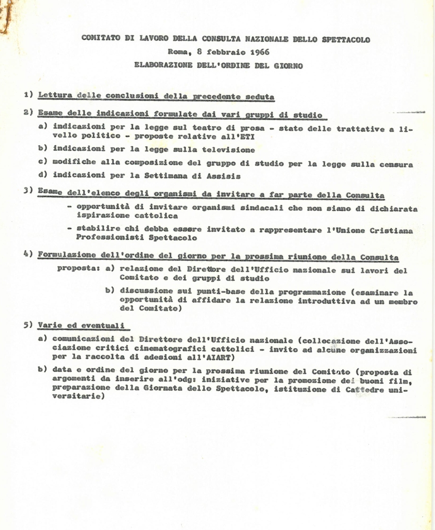 "Comitato di lavoro della Consulta nazionale dello spettacolo, Roma 8 febbraio 1966, elaborazione dell'ordine del giorno"