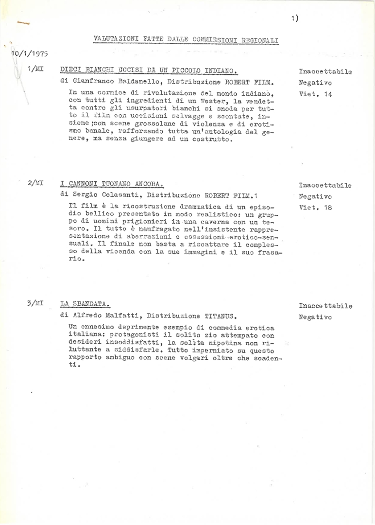 Schede dei film soggetti a revisione da parte delle commissioni regionali. Dattiloscritto