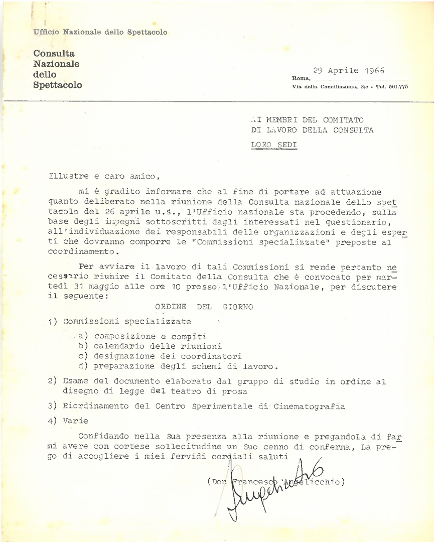 | Destinatario | Membri del Comitato di lavoro della Consulta Nazionale dello Spettacolo |