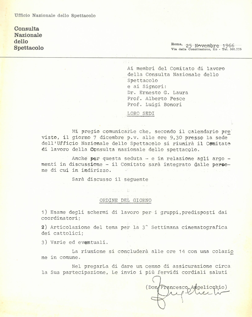 Lettera di don. Francesco Angelicchio, direttore dell'Ufficio nazionale dello spettacolo, ai membri del Comitato di lavoro della Consulta nazionale dello spettacolo e a Ernesto Laura, Alberto Pesce, Luigi Bonori