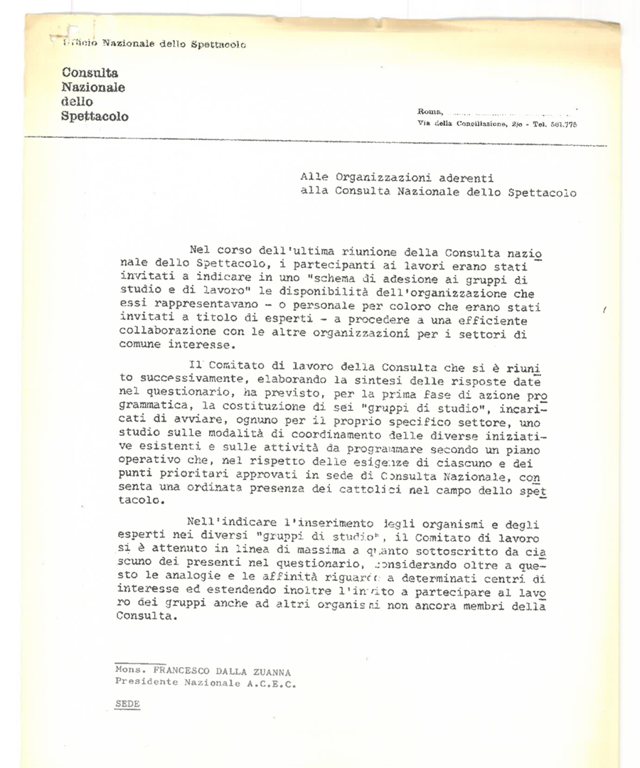 Lettera di don Francesco Angelicchio, direttore dell'Ufficio nazionale dello spettacolo, a mons. Francesco Dalla Zuanna, presidente dell'ACEC