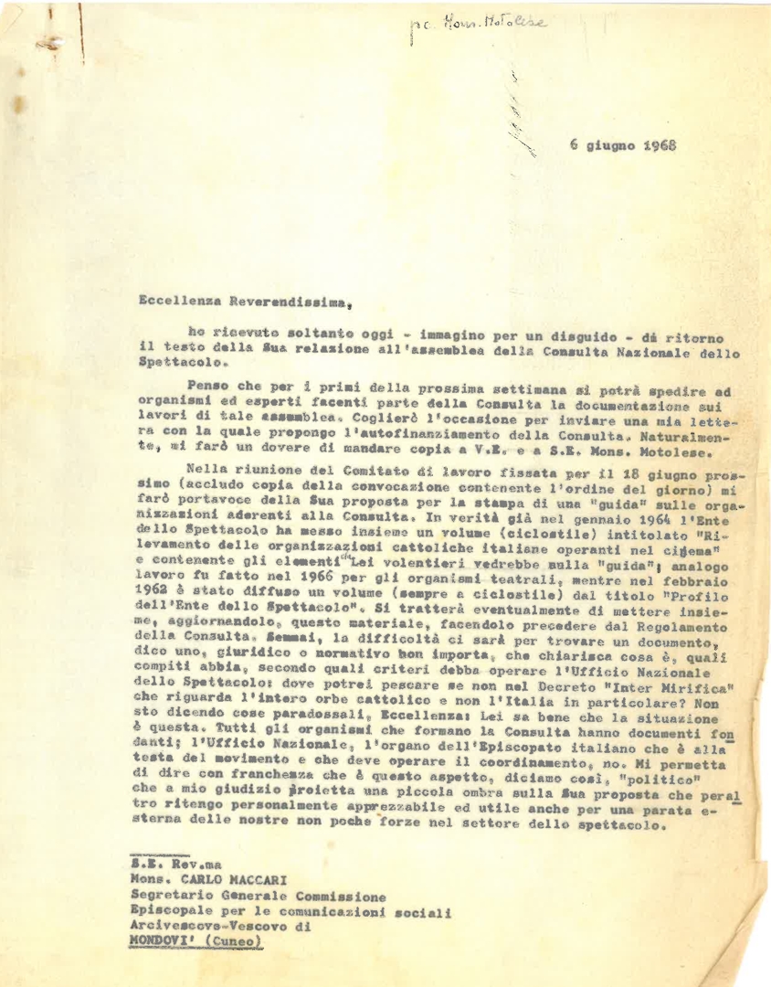 Lettera di Silvano Battisti, segretario della Consulta nazionale dello spettacolo, a don Carlo Maccari, arcivescovo di Mondovì in provincia di Cuneo