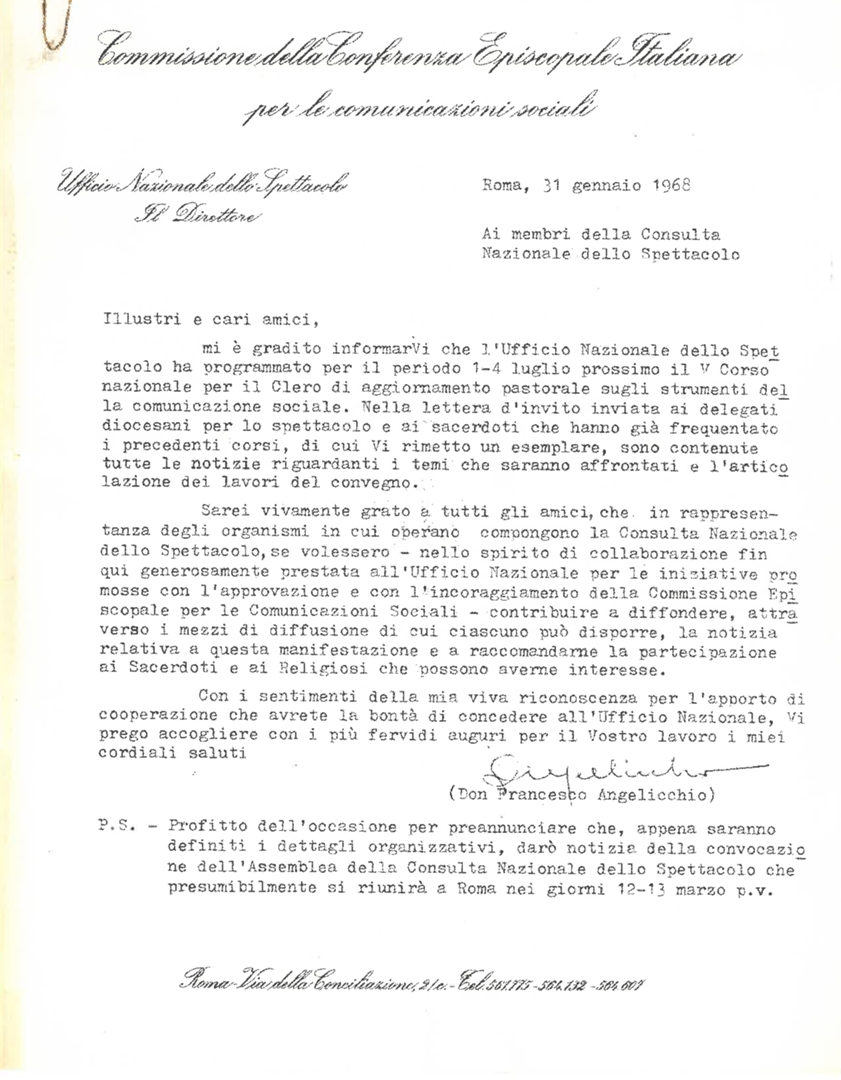 Lettera di don Francesco Angelicchio, direttore dell'Ufficio nazionale dello spettacolo, ai membri della Consulta nazionale dello spettacolo