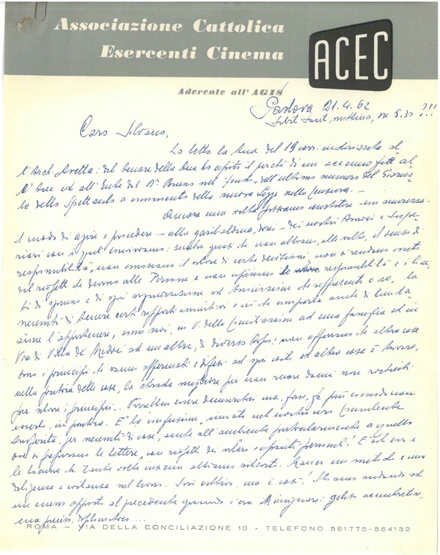 Lettera di mons. Francesco Dalla Zuanna, presidente dell'ACEC, a Silvano Battisti, segretario generale dell'ACEC