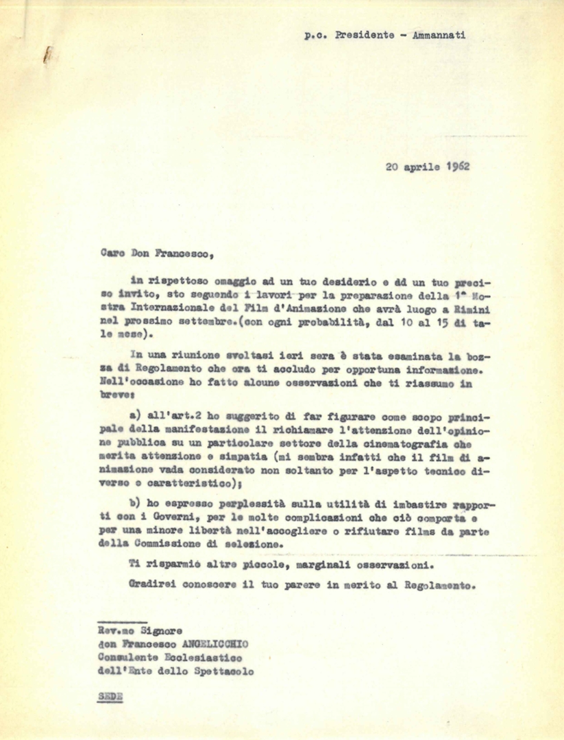 Silvano Battisti scrive a don Francesco Angelicchio a proposito della 1^ Mostra internazionale del film d'animazione in programma a Rimini per il mese di settembre 1962 e allega la bozza del regolamento della manifestazione. Dattiloscritto