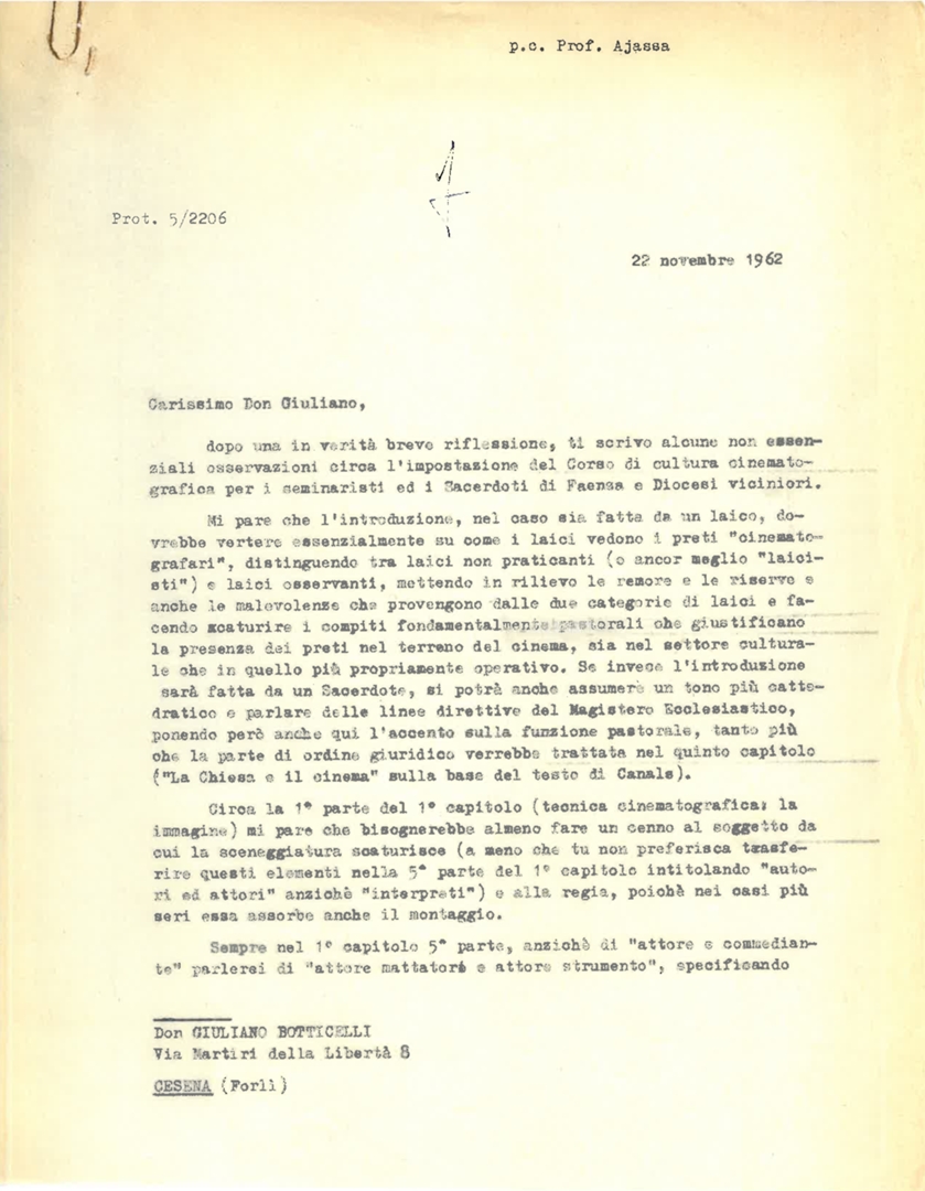 Programma di massima, con lettera di trasmissione di Silvano Battisti, segretario generale dell'ACEC, a don Giuliano Botticelli. Dattiloscritto