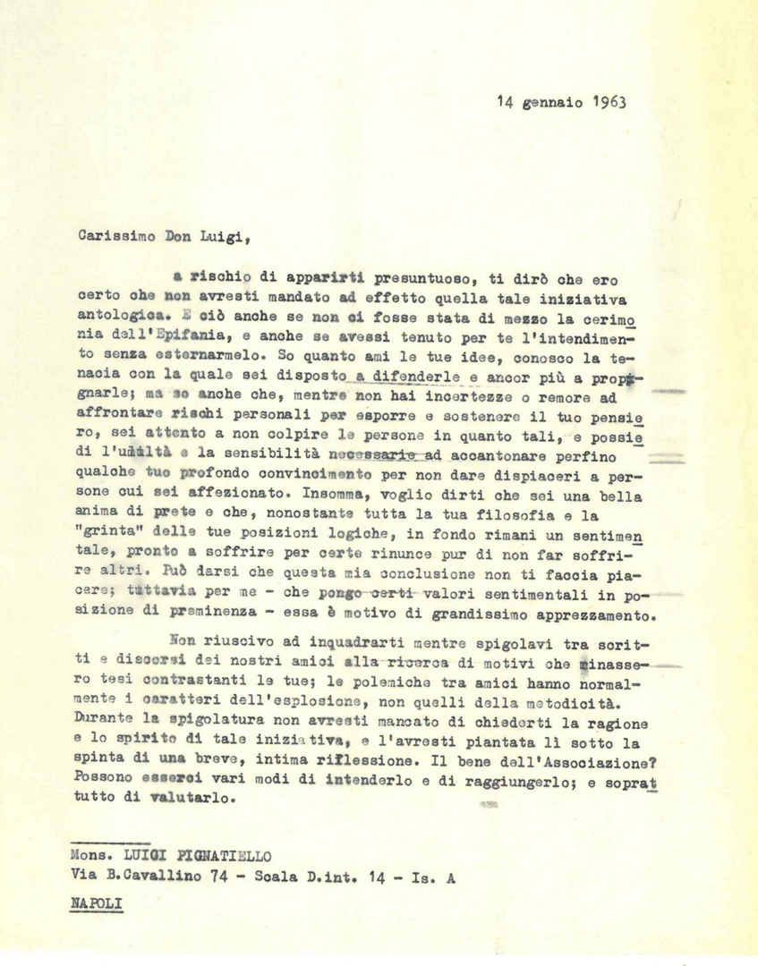 Silvano Battisti risponde a Luigi Pignatiello riguardo la festività dell'Epifania e in merito alle sue posizioni personali nei confronti dell'Associazione. Dattiloscritto