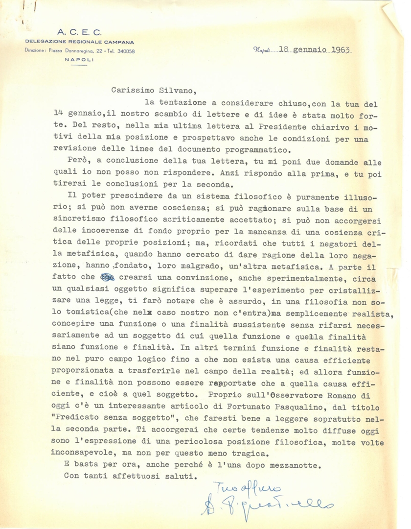 Luigi Pignatiello scrive a Silvano Battisti ancora a proposito di riflessioni personali e al documento programmatico. Dattiloscritto