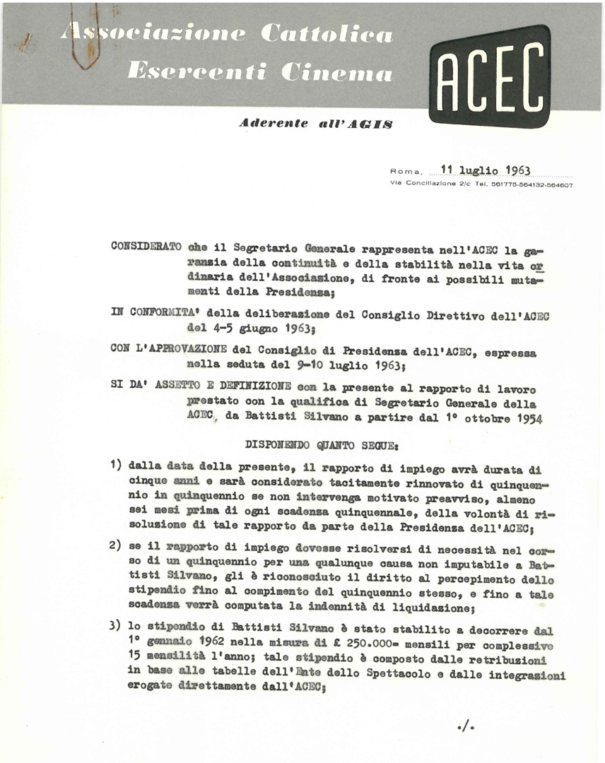 Rapporto di lavoro prestato con la qualifica di segretario generale dell'ACEC da Silvano Battisti a partire dal 1° ottobre 1954. Dattiloscritto