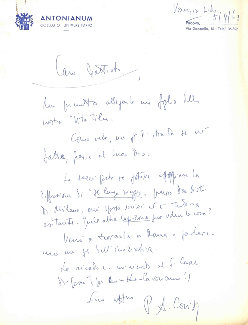 Con lettera di trasmissione di padre Antonio Covi, del Collegio universitario Antonianum, a Silvano Battisti, segretario generale dell'ACEC. Manoscritto e locandine a stampa