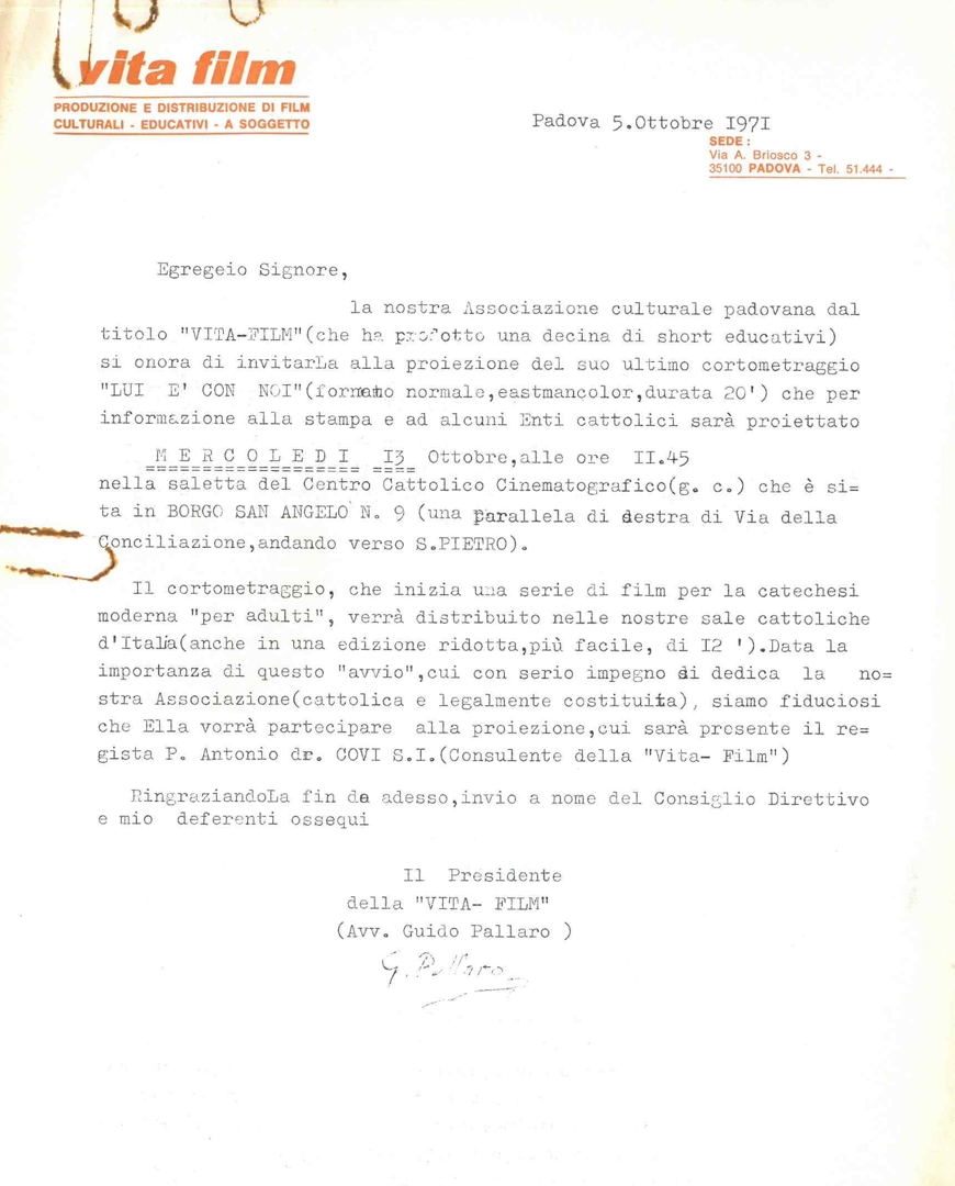 Invito alla proiezione del cortometraggio "Lui è con noi" a firma di Guido Pallaro, presidente della Vita-Film