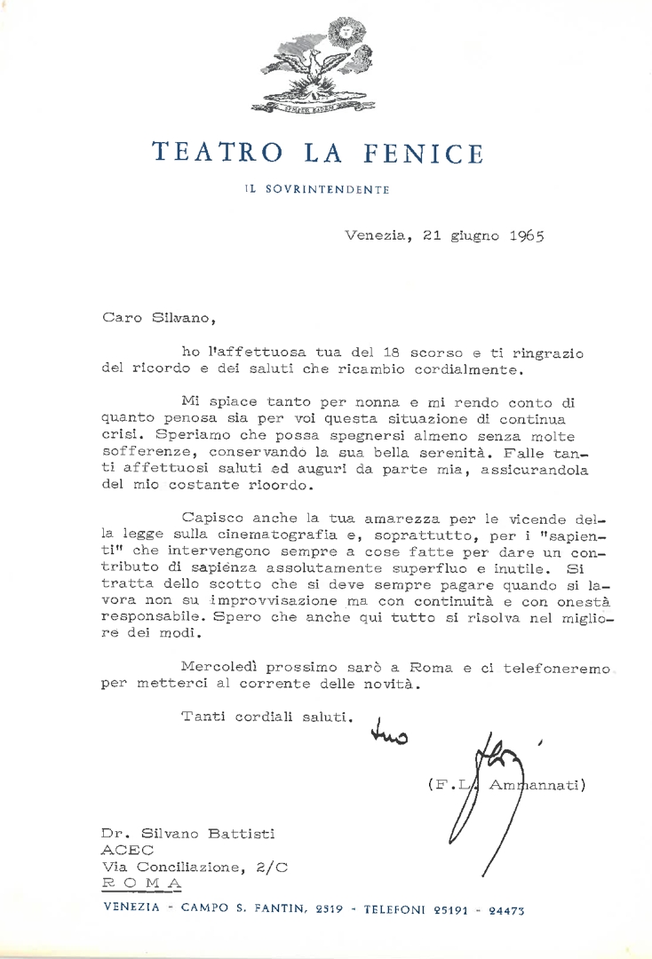 Lettera di Floris Luigi Ammannati, sovrintendente del Teatro La Fenice di Venezia e consulente tecnico dell'ACEC, a Silvano Battisti, segretario generale dell'ACEC