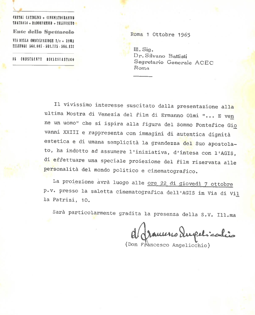 Don Francesco Angelicchio invita Silvano Battisti alla proiezione del film di Ermanno Olmi "...E venne un uomo". Dattiloscritto