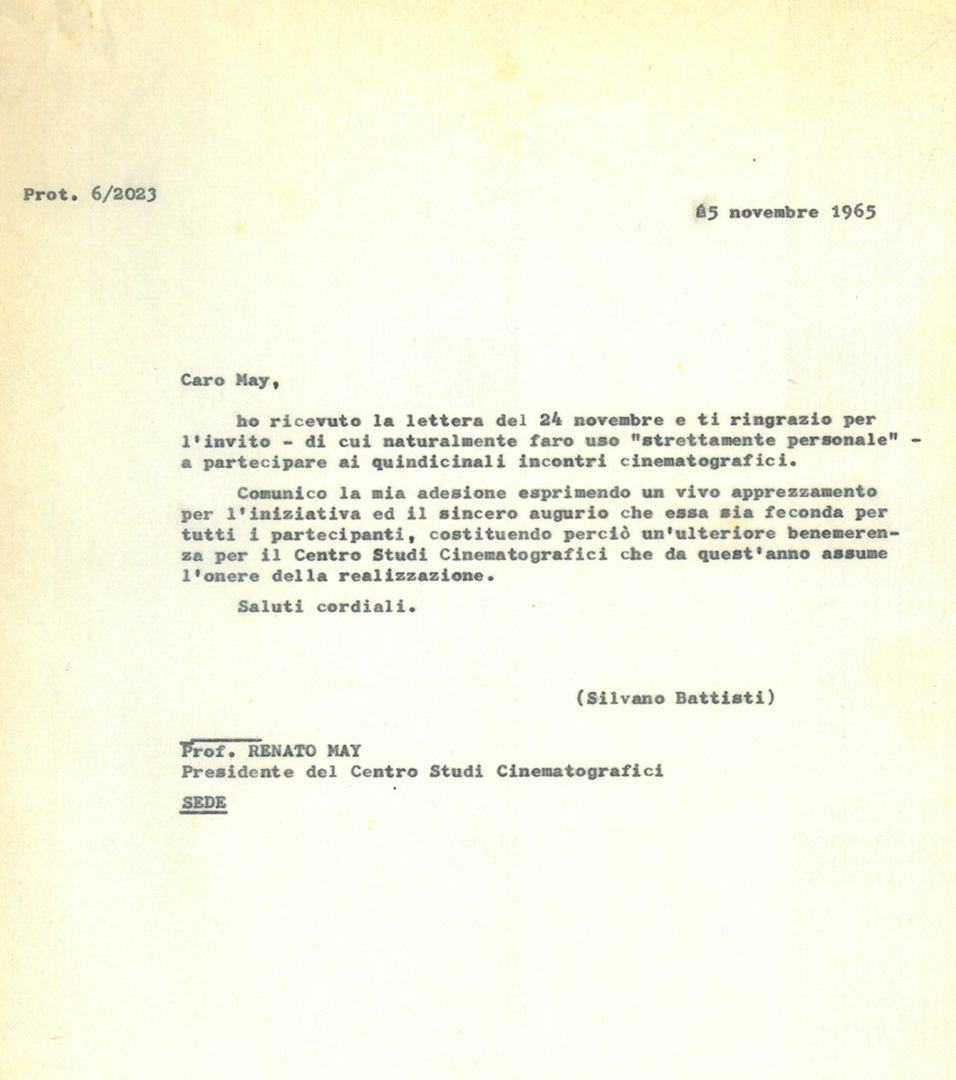 Silvano Battisti risponde a Renato May comunicando la sua adesione agli incontri cinematografici quindicinali. Dattiloscritto