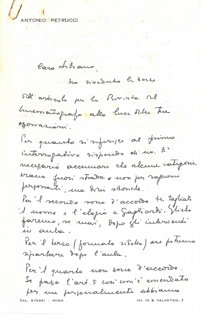 Antonio Petrucci risponde a Silvano Battisti sulla bozza dell'articolo riguardante la legge sul cinema da pubblicarsi sulla "Rivista del Cinematografo". Manoscritto