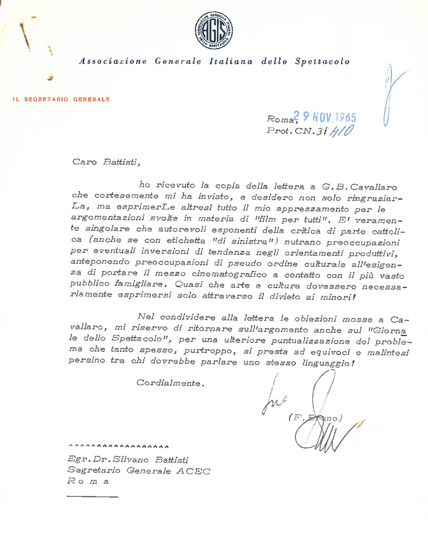 Lettera di Franco Bruno, segretario generale dell'Associazione generale italiana dello spettacolo - AGIS, a Silvano Battisti, segretario generale dell'ACEC