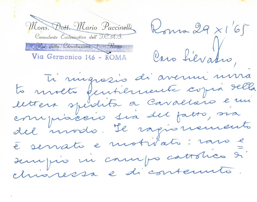 Lettera di mons. Mario Puccinelli, consulente ecclesiastico dell'ICAS, a Silvano Battisti, segretario generale dell'ACEC