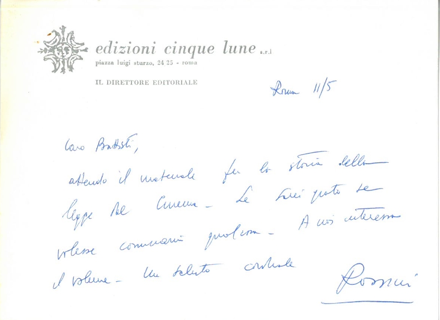 Giuseppe Rossini chiede a Silvano Battisti materiale per la storia della legge sul cinema. Manoscritto