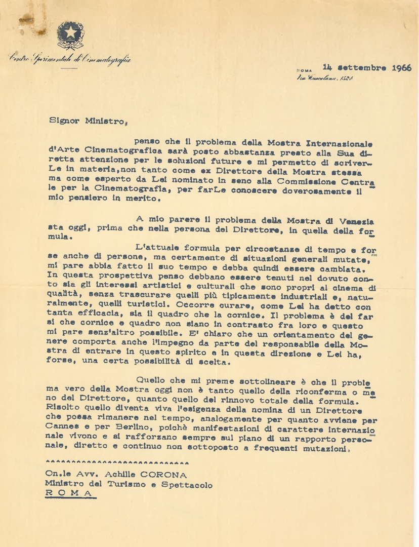 Floris Luigi Ammannati scrive all'on. Achille Corona in merito alla nomina del nuovo direttore della Mostra internazionale d'arte cinematografica di Venezia e al rinnovo della formula della manifestazione. Dattiloscritto
