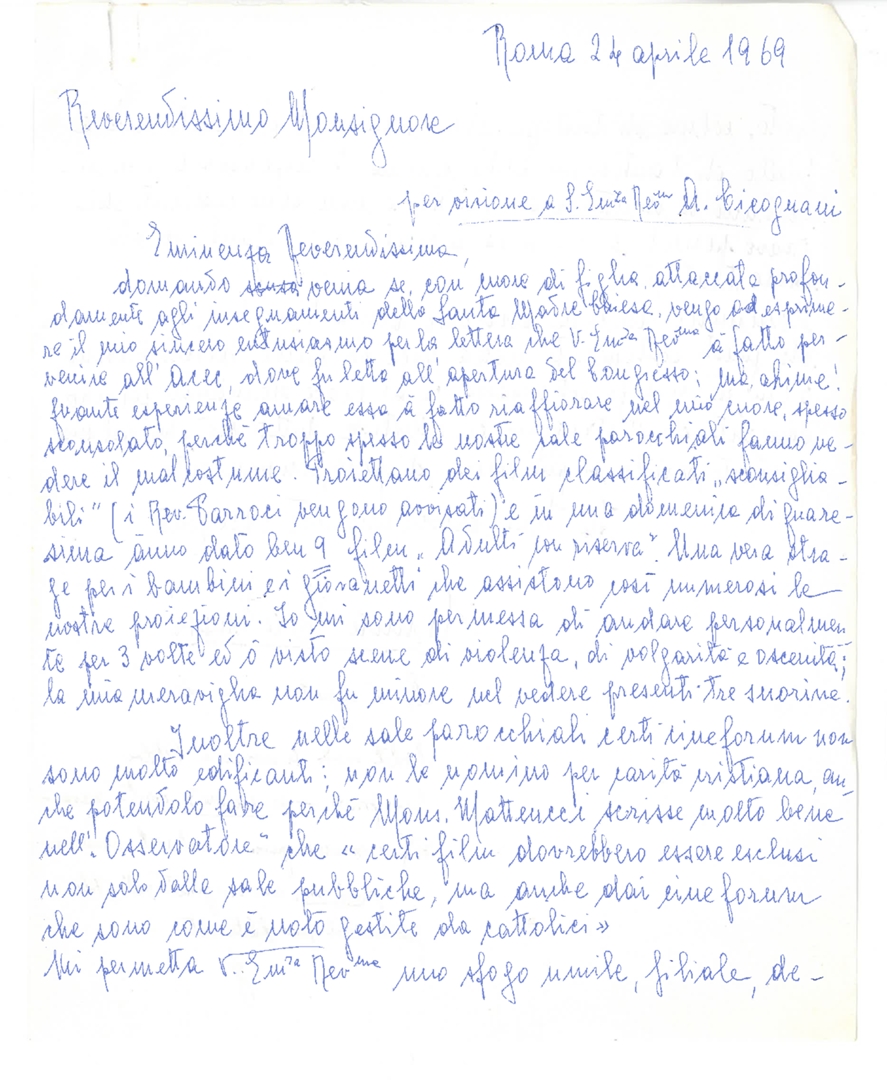 Anna Calussi segnala a mons. Amleto Giovanni Cicognani l'immoralità della programmazione delle sale cinematografiche parrocchiali. Manoscritto