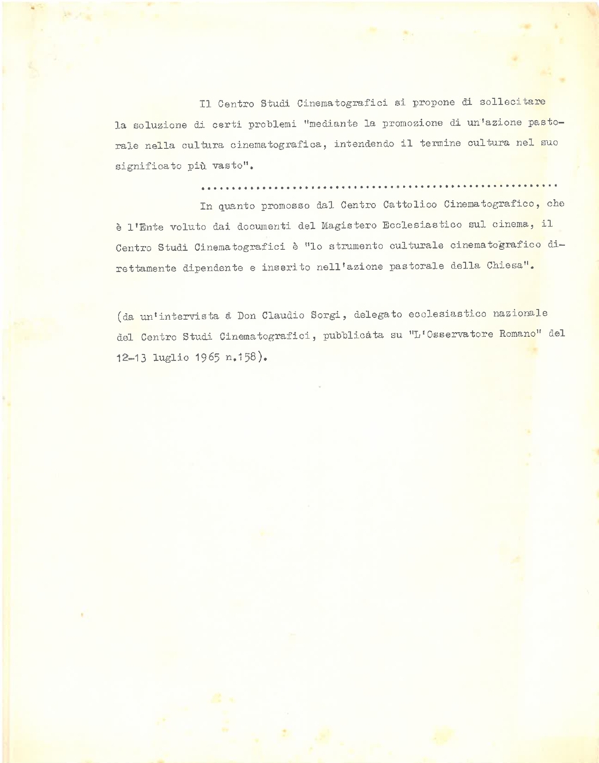 Stralcio di un'intervista a don Claudio Sorgi, delegato ecclesiastico nazionale del Centro studi cinematografici - CSC, pubblicata su L'Osservatore Romano del 12-13 luglio 1965, n. 158