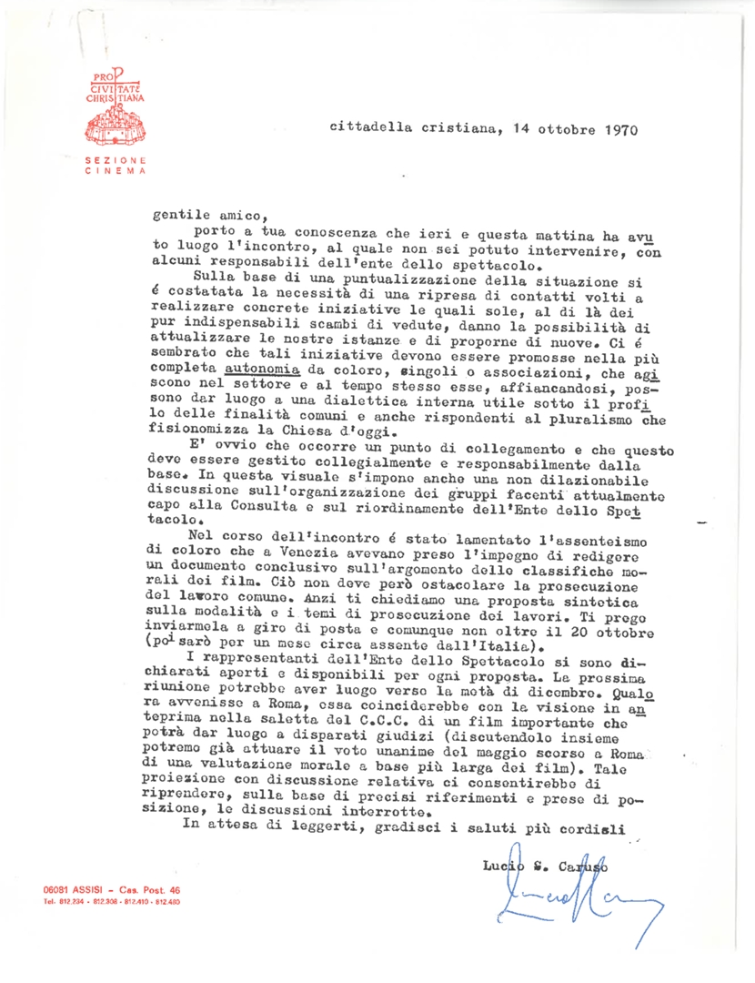 Lettera di Lucio Settimio Caruso, volontario laico della "Pro Civitate Christiana" e direttore della sezione cinema della stessa Associazione con sede nella Cittadella Cristiana, a destinatario non indicato