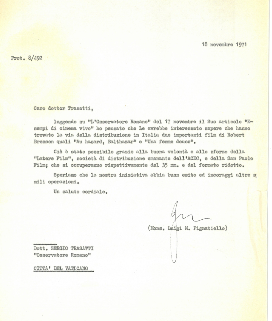 Mons. Luigi Pignatiello scrive a Sergio Trasatti per segnalare la distribuzione in Italia dei film Au hasard Balthazar e Une femme douce di Robert Bresson. Dattiloscritto