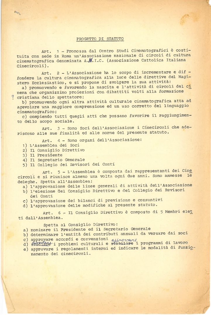 Istituzione di un'associazione nazionale di circoli di cultura cinematografica con lo scopo di incrementare e diffondere la cultura cinematografica alla luce delle direttive del Magistero ecclesiastico. Dattiloscritto