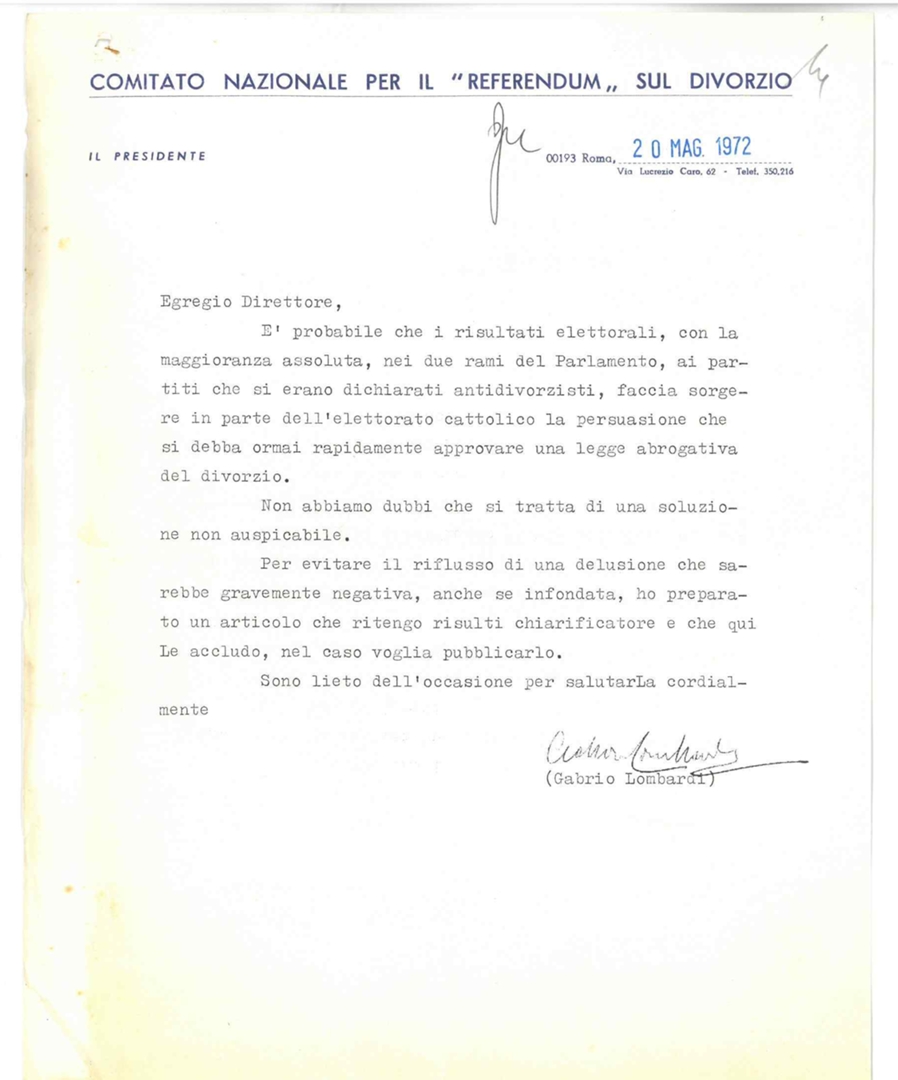 Con lettera di trasmissione di Gabrio Lombardi, presidente del comitato nazionale per il referendum sul divorzio, a destinatario non indicato. Dattiloscritto
