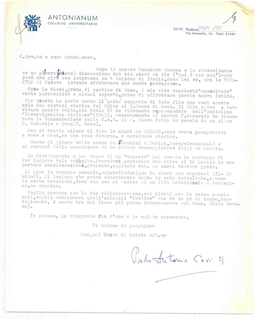 Lettera di padre Antonio Covi, del collegio universitario Antonianum di Padova, a destinatario non indicato