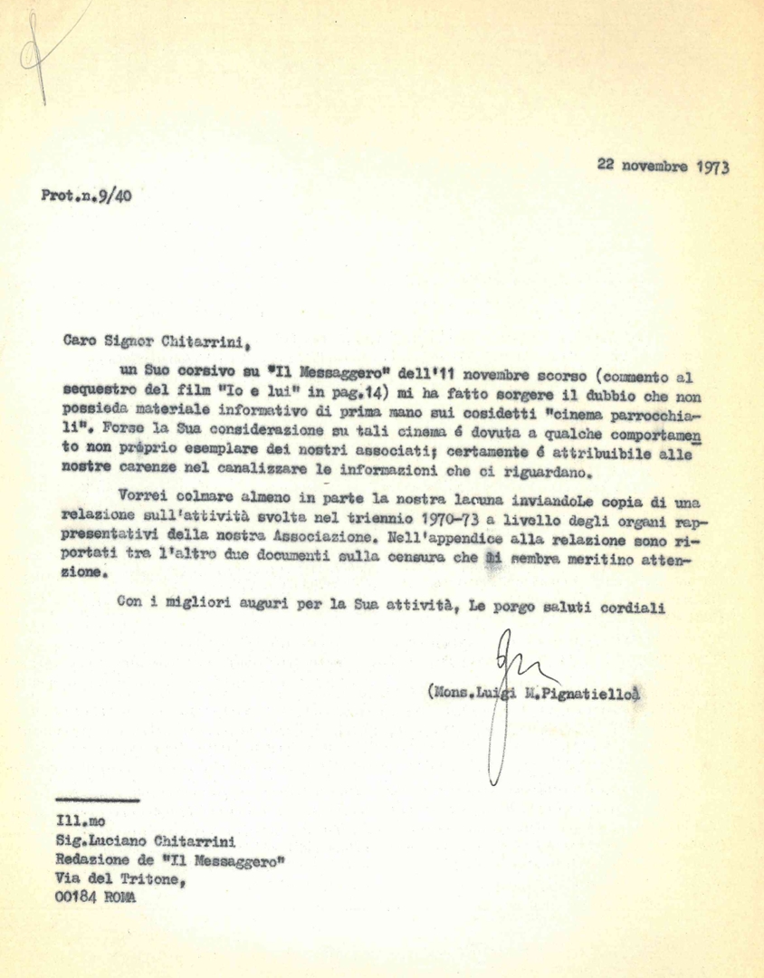 Mons. Luigi Pignatiello scrive a Luciano Chitarrini in merito ad un articolo apparso sul quotidiano riguardante l'attività delle sale cinematografiche parrocchiali. Dattiloscritto