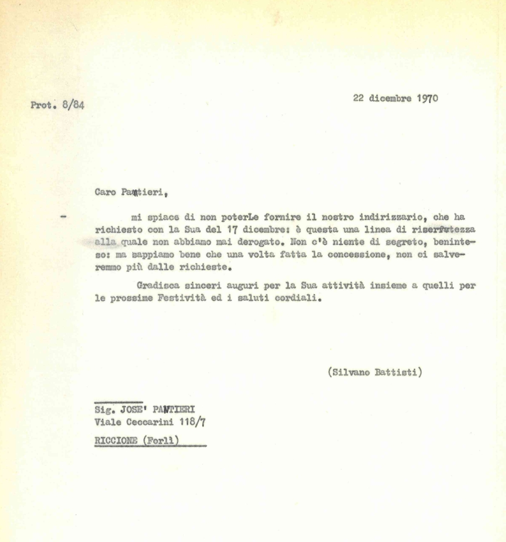 Silvano Battisti comunica a José Pantieri l'impossibilità di fornire l'indirizzario dell'ACEC per ragioni di riservatezza. Dattiloscritto