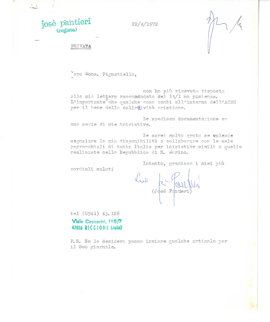 Brochure a stampa dei corsi e lettera di trasmissione dattiloscritta di José Pantieri a mons. Luigi Pignatiello, presidente dell'ACEC