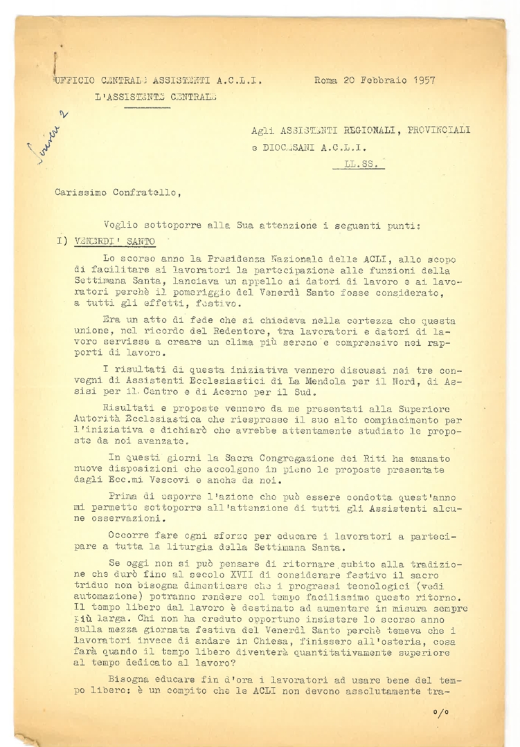 Lettera di mons. Santo Quadri, assistente centrale ACLI, agli assistenti regionali, provinciali e diocesani ACLI