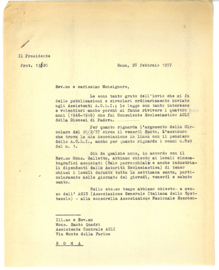 Lettera di mons. Francesco Dalla Zuanna, presidente dell'ACEC, a mons. Santo Quadri, assistente centrale ACLI