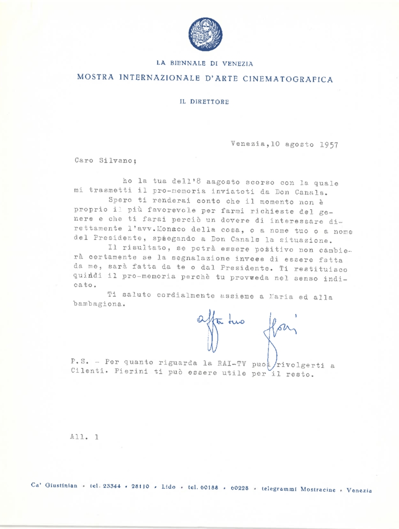 Lettera di Floris Luigi Ammannati, direttore della Mostra internazionale d'arte cinematografica di Venezia, a Silvano Battisti, segretario generale dell'ACEC
