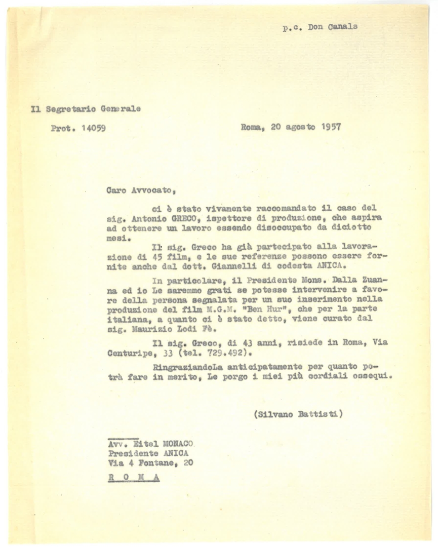 Lettera di Silvano Battisti, segretario generale dell'ACEC, a Eitel Monaco, presidente dell'Associazione nazionale industrie cinematografiche ed affini - ANICA