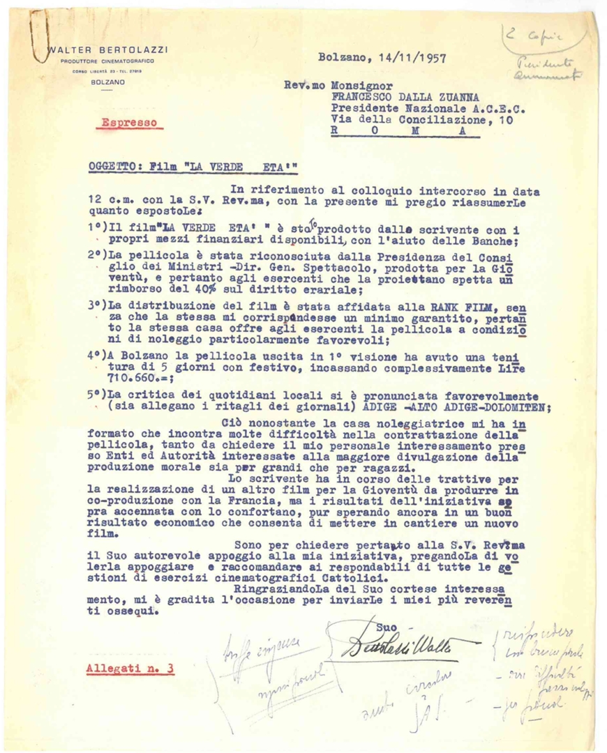 Walter Bertolazzi chiede a mons. Francesco Dalla Zuanna di promuovere nelle sale parrocchiali la proiezione del film "La verde età". Allega due ritagli di stampa con un'intervista al produttore. Dattiloscritto