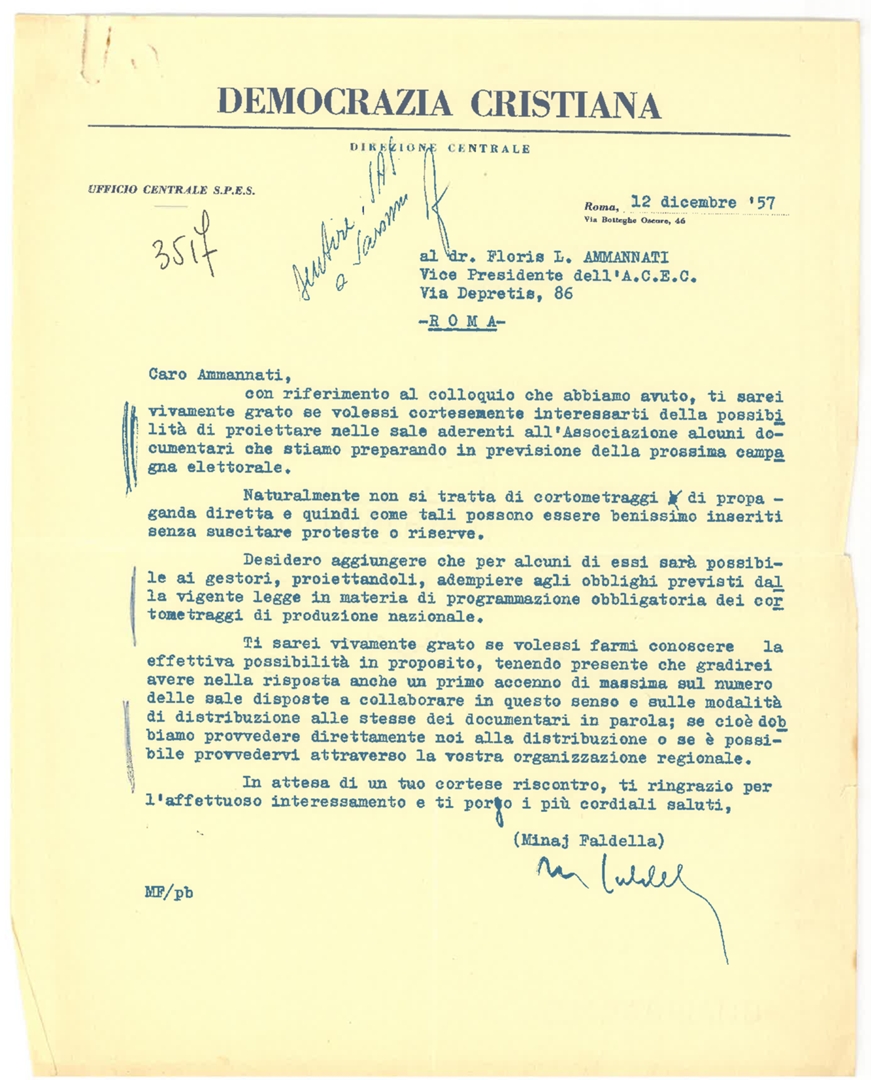Minaj Faldella chiede a Floris Luigi Ammannati di proiettare nelle sale aderenti all'Associazione alcuni documentari in vista della campagna elettorale. Dattiloscritto