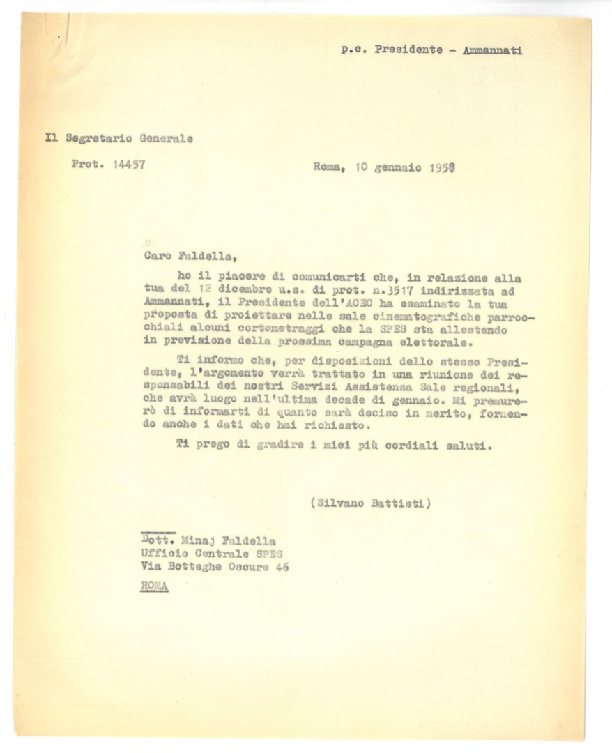 Silvano Battisti comunica a Minaj Faldella che è all'esame la possibilità di proiettare nelle sale parrocchiali alcuni documentari della SPES in previsione della campagna elettorale. Dattiloscritto