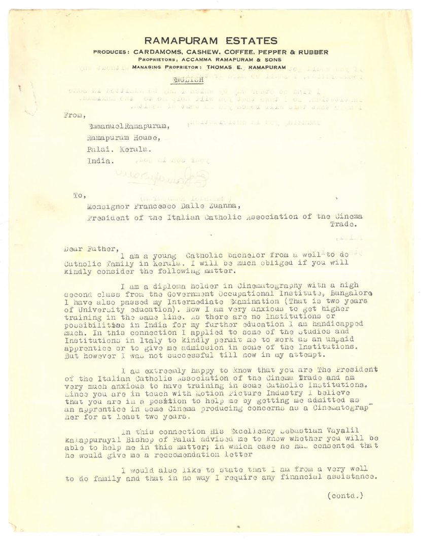 Emmanuel Ramapuram si rivolge a mons. Francesco Dalla Zuanna in merito alla possibilità di svolgere un tirocinio presso una compagnia di produzione cinematografica in Italia. Dattiloscritto