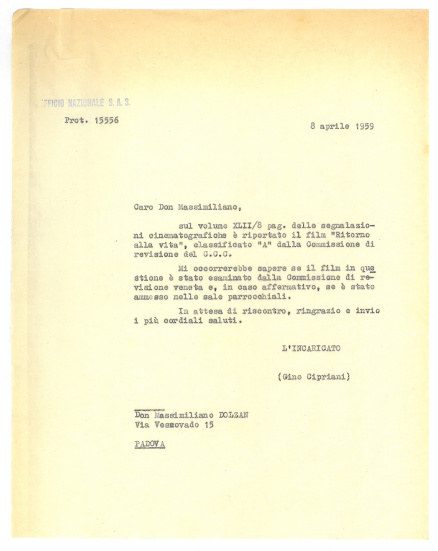 Gino Cipriani scrive a don Massimiliano Dolzan in merito alla classificazione del film "Ritorno alla vita" e alla sua ammissione presso le sale cinematografiche parrocchiali. Dattiloscritto